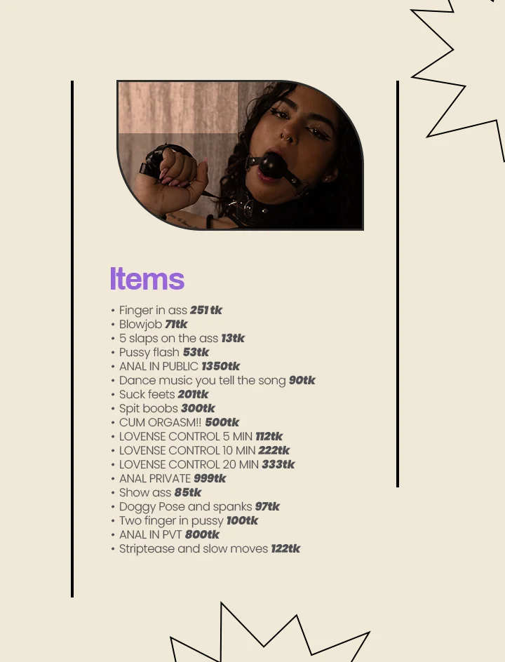 Azotes, Baile Erótico, Cameltoe, Cock Rating, Dirty Talk, Garganta Profunda, Ahegao, A Cuatro, Dedos, Estriptis, Fetichismo de Pies, Jerk-off Instruction, Humillación, Dildo o Vibrador, Juego de Roles, Flashing, Mamada, Masturbación, Show con Aceite, Twerking, Upskirt, Yoga, Vaquera, Paja